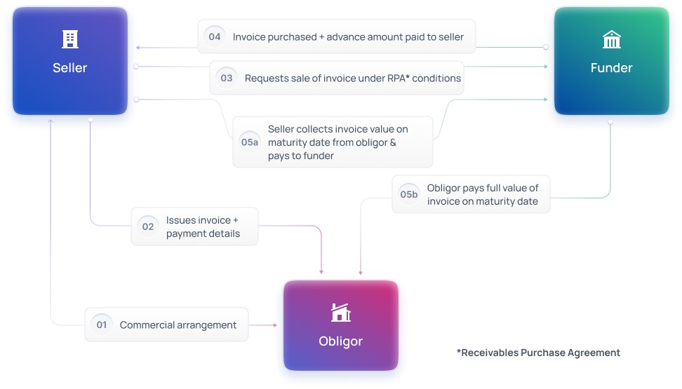 A supplier – often called the seller – sells/reassigns their invoices to a third-party at a discount, in exchange for an immediate payment.